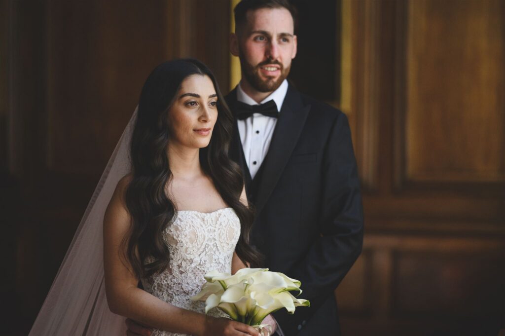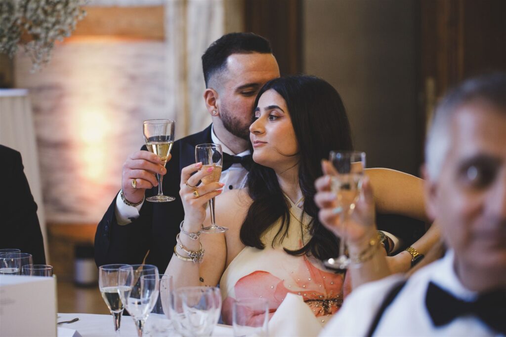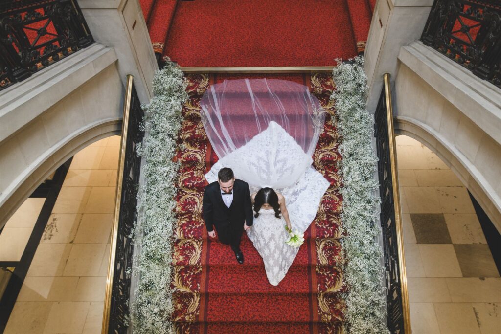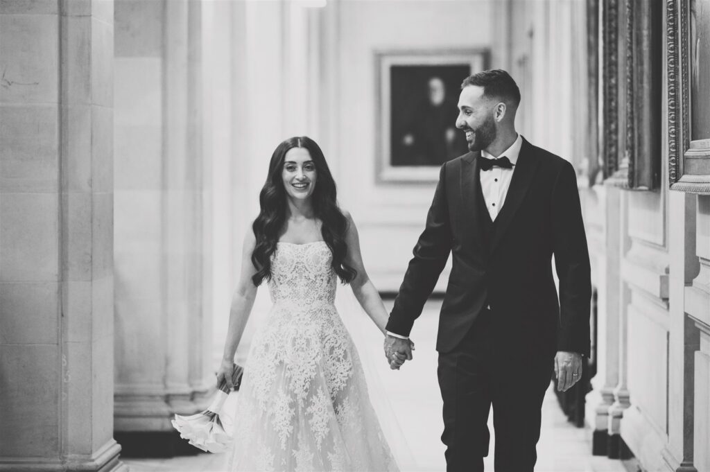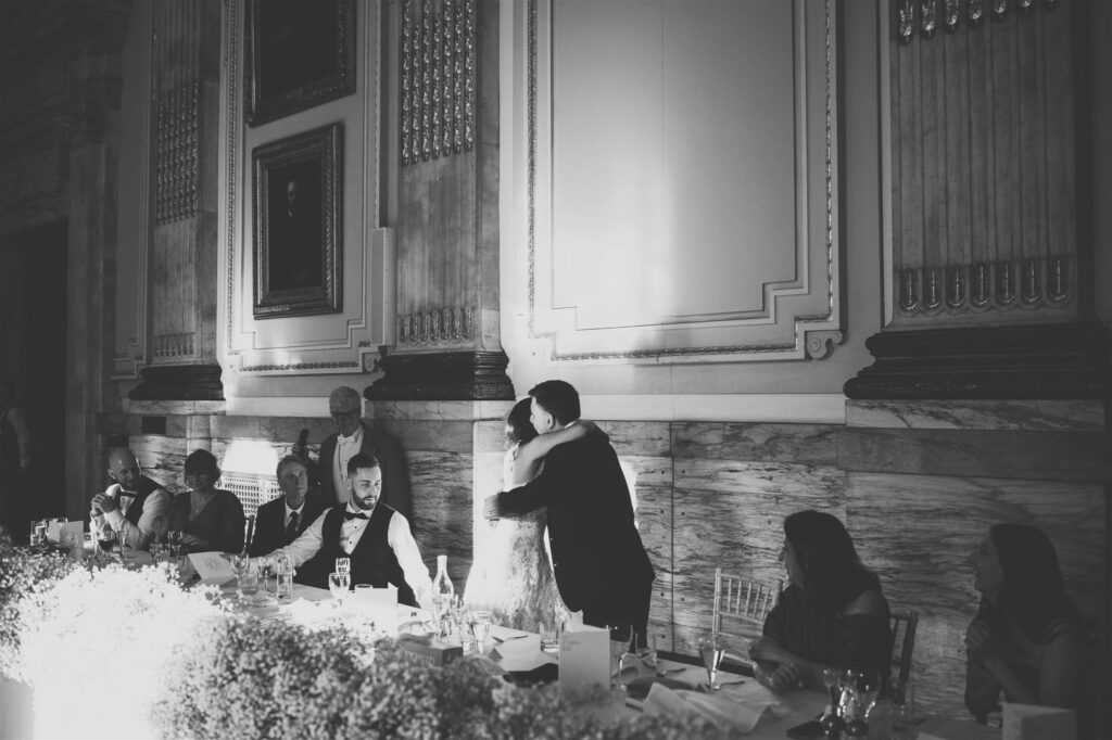 While guests mingled downstairs with drinks and canapés, we snuck away for some couple portraits. The building is full of incredible photo opportunities – from the romantic ‘Romeo and Juliet’ balcony to the grand staircase that’s made for timeless portraits. Christina and James wanted their photos to feel relaxed and natural, so after a few indoor shots, we went for a walk towards Parliament just as the sun was setting. London gave us its very best light, and the mix of history, architecture, and a couple totally in love made for some gorgeous images.