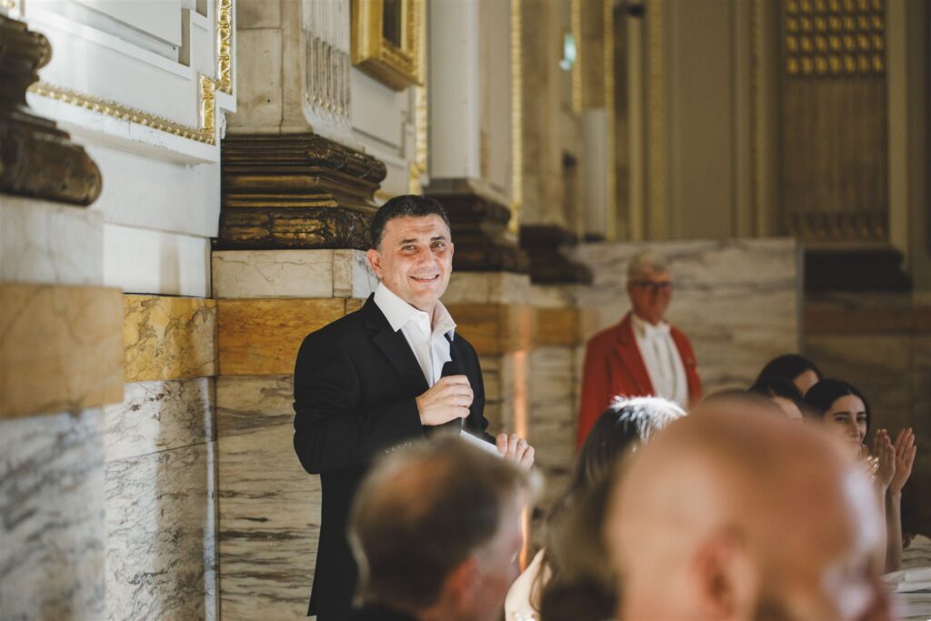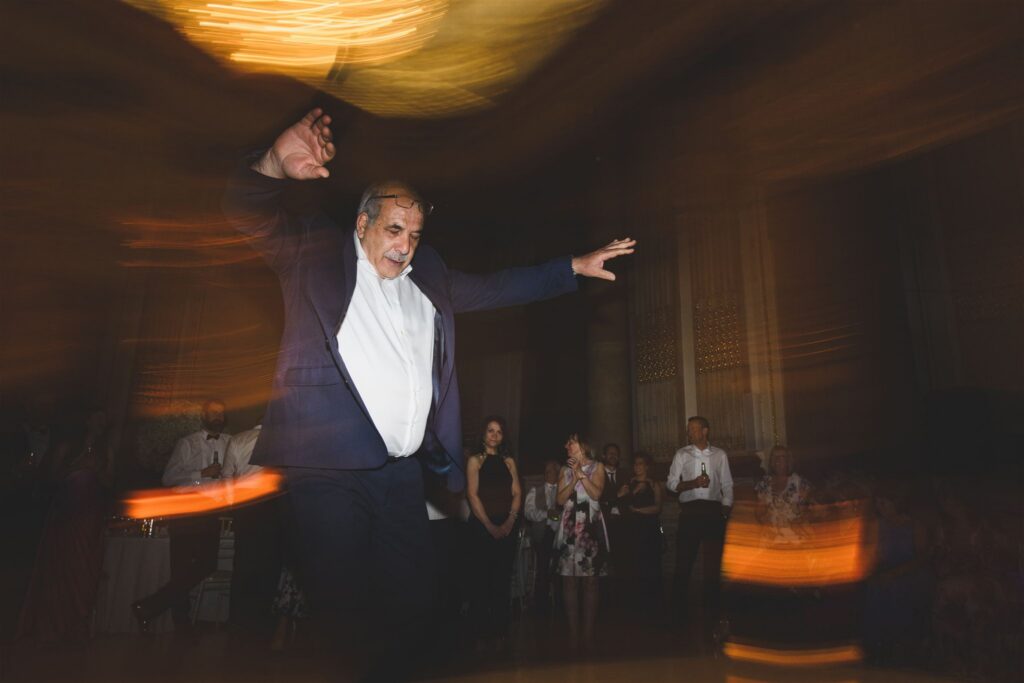 After the wedding breakfast and some brilliant speeches, the evening really came alive with traditional Greek dancing – full of energy, laughter, and everyone getting involved. Once the formal dancing wrapped up, the party kicked off properly in the spectacular Great Hall. With its chandeliers, high ceilings, and incredible atmosphere, it’s a dream setting for a wedding party – and these guests made the most of every second.